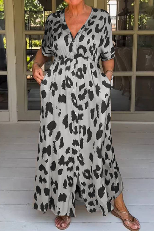 Leopard Print Casual Loose V-neck Short-sleeved Pocket Midi Dress