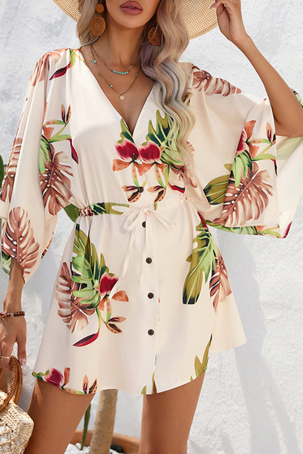 Botanical Print Button Drawstring Waist Dolman Sleeve Loose Romper