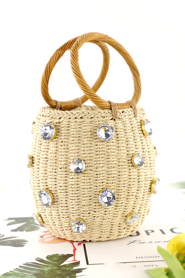 Fashionable Imitation Rhinestone Embellished Casual Barrel Rattan Bag
